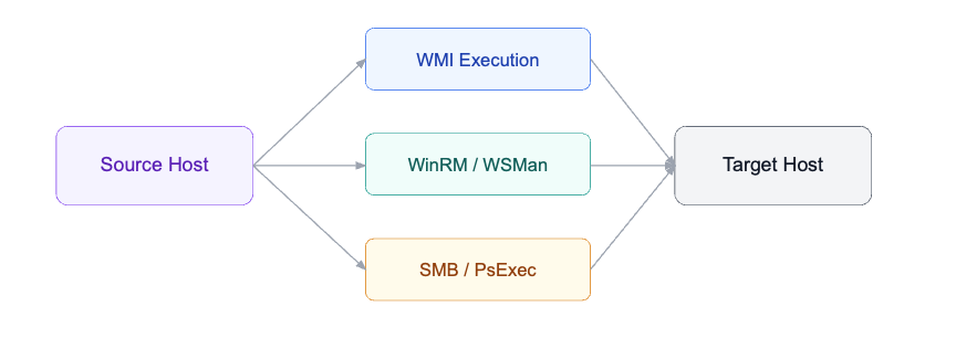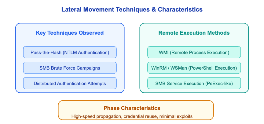 Key techniques observed included Pass-the-Hash (PtH) attacks using NTLM authentication, ongoing SMB brute force campaigns targeting administrative access, and distributed authentication attempts across multiple systems. Remote execution was achieved through native Windows mechanisms such as Windows Management Instrumentation (WMI) for remote process execution, WinRM/WSMan for PowerShell-based command execution, and SMB-based service execution resembling PsExec behavior for payload deployment. This phase was characterized by high-speed propagation across the network, extensive reuse of administrative credentials across multiple systems, and minimal reliance on exploits after initial access, reflecting a shift towards “living off the land” tactics.