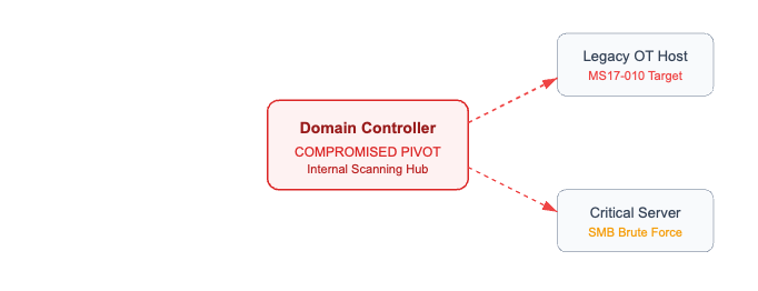 Following reconnaissance, the attacker transitioned into exploitation and access expansion. Observed behaviors included high-volume SMB authentication attempts characterized by password spraying and brute force patterns, the use of automated tooling to identify weak or reused credentials, and exploitation attempts consistent with SMB vulnerabilities. Notably, techniques aligned with MS17-010 (EternalBlue) were employed to target unpatched or legacy systems.