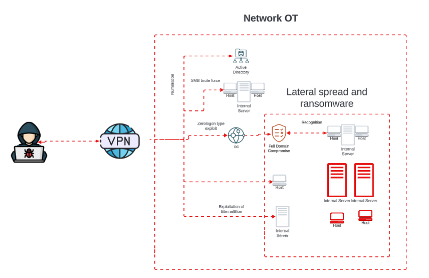 • Networks with reachable backups and shared storage, enabling the operator to maximize blast radius and extortion value.