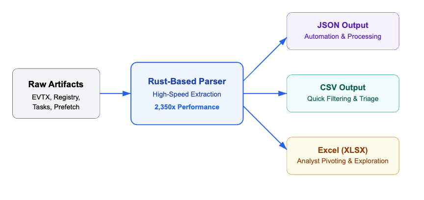Beyond parsing, a key design decision was to normalize all extracted artifacts into structured, analysis-ready formats. The pipeline automatically converts parsed data into JSON for structured processing and automation, CSV for rapid filtering and bulk triage, and Excel (XLSX) for analyst-friendly exploration and data pivoting. This approach ensures that the same dataset can be efficiently consumed across different stages of the investigation, from automated processing to interactive analysis.
