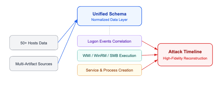By standardizing all artifacts into a unified schema, we were able to merge data from multiple sources and hosts into a single analytical layer. This enabled the correlation of key events such as logon activity, remote execution via WMI, WinRM, and SMB, service creation, and process execution. As a result, we generated a high-fidelity, cross-host timeline of attacker activity, providing a coherent and accurate reconstruction of the intrusion across the entire environment.
