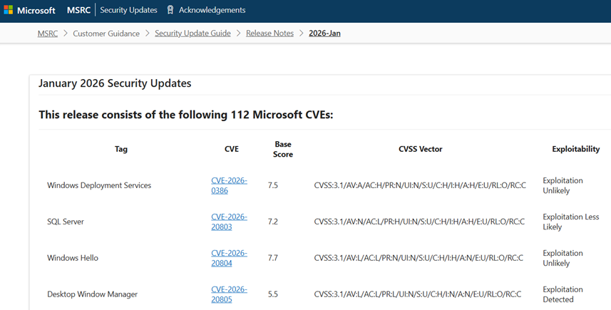 January 2026 Security Updates – Release Notes – Security Update Guide – Microsoft